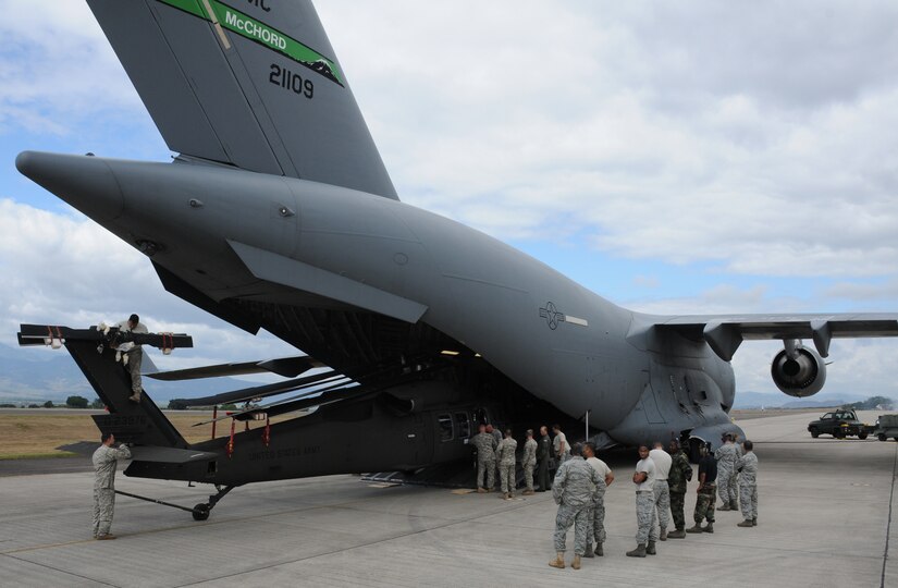 SOTO CANO AIR BASE, Honduras -- Checking to make sure they're clearing the ramp, members of the 1-228th Aviation Regiment pull a Black Hawk helicopter from inside a C-17 Globemaster III here Dec. 9. The helicopter, which was delivered by the C-17 out of McChord AFB, Wash., was returned to Soto Cano after receiving repairs in the U.S. (U.S. Air Force photo/Tech. Sgt. Benjamin Rojek)
