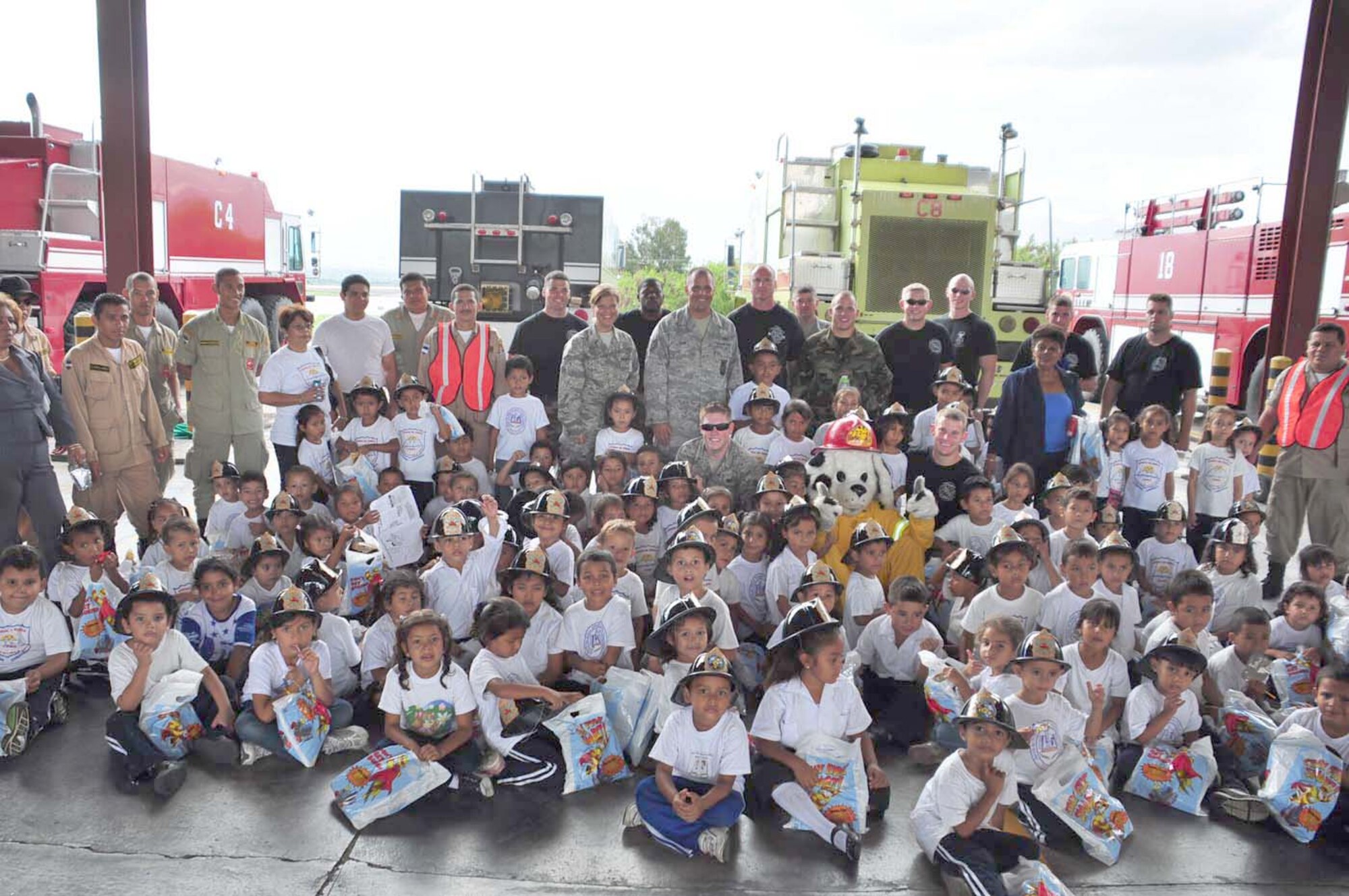 SOTO CANO AIR BASE, Honduras — Tech Sgt. Mike Cain, Joint Task Force-Bravo firefighter, hands out candy to some children during the fire department’s fire prevention week “kid’s day” here Oct. 6. About 175 children from different schools in La Paz and Comayagua traveled to base to learn some important lessons about fire prevention. The children got to tour the fire house, watch several demonstrations on how firefighters fight fires and they got to meet “Sparky the fire dog.” Every year during the week of Oct. 8 fire stations around the country reach out to the community to remind families of the importance of fire prevention (U.S. Air Force photo/Staff Sgt. Chad Thompson).