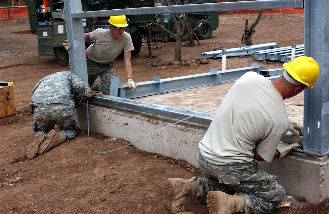 LAS MESAS, HON - Spc. Jesse Brennan (right), Spc. Dustin Roberts (ACU) and Sgt. Gabriel Feuerhelm, all of the 322nd Engineer Company, Decorah, Iowa, attach a bottom brace to the steel framework wall of a new latrine that they are building here April 16. Photo by Staff Sgt. Danny McCormick, Beyond the Horizon public affairs.