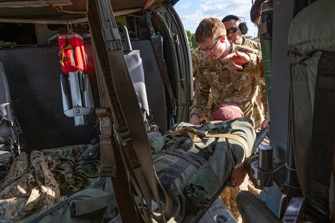 Joint Task Force-Bravo load a dummy patient into a helicopter during an air enroute care training at Soto Cano Air Base, Honduras, February 5, 2025. During the three day training members learned how to assess, care for and safely load a patient into a helicopter in case of a medical evacuation. (U.S. Air Force photo by Staff Sgt. Tristan Biese)