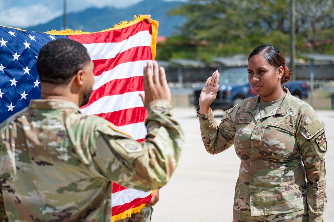 U.S. Air Force Staff Sgt. Karla Cartagena, 612th Air Base Squadron non-commissioned officer in charge of airfield management operations and training, raises her right hand as she recites the oath of enlistment during her reenlistment ceremony at Soto Cano Air Base, Honduras, February 5, 2025. As the NCOIC of operations, Karla maintains administration accountability and data integrity involving airfield management. (U.S. Air Force photo by Staff Sgt. Tristan Biese)